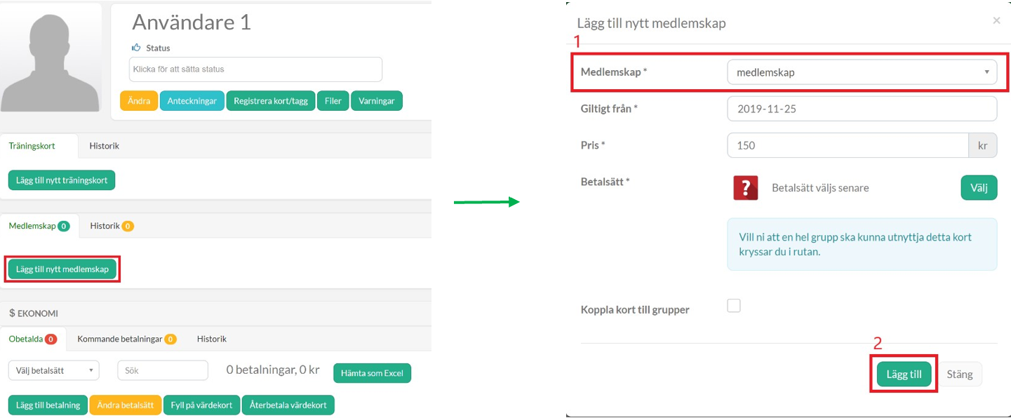 - Välj valfri person och inne på deras profil klicka på lägg till medlemskap. Välj rätt medlemskap och tryck på lägg till. (Detta kräver att du skapat ett medlemskap, se manual ”Manual – Medlemskap för försäljning)