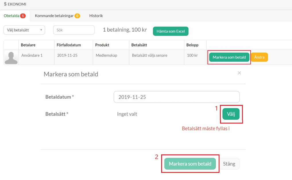 - Kontot kommer nu ha en skuld, vilket beror på att betalning skett utanför KIT och systemet vet inte att hen har betalat. Scrolla ner till kategorin EKONOMI och klicka på Markera som Betald. Välj betalsätt Bank och klicka sedan på Markera som betald. Detta steg innebär att Korpen Svenska Motionsidrottsförbundet skiljer på aktiva medlemmar och inaktiva medlemmar i föreningar. Föreningen faktureras 50 kronor/medlem för aktiva medlemmar i KIT, det vill säga debiteringen sker först när detta steg fullföljts.